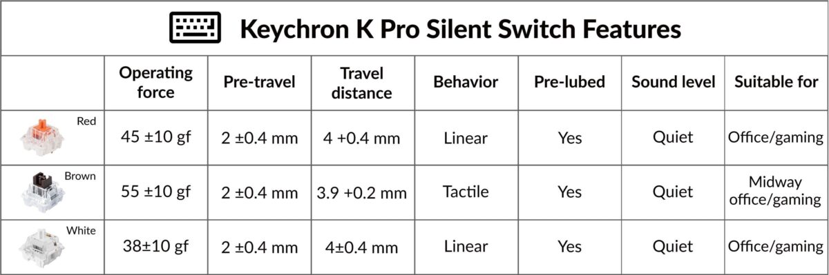 Οι εργοστασιακά προ-λιπαινόμενοι διακόπτες Keychron Silent K Pro στοχεύουν να προσφέρουν μια εξαιρετικά ομαλή, αθόρυβη και φυσική εμπειρία πληκτρολόγησης. Όπως υποδηλώνει το όνομα, η ένταση του ήχου με έναν αθόρυβο διακόπτη είναι σημαντικά χαμηλότερη, γεγονός που είναι ιδανικό για χώρους με ηχητικούς περιορισμούς και για παίκτες που δεν θέλουν να ενοχλούν τους άλλους τη νύχτα.