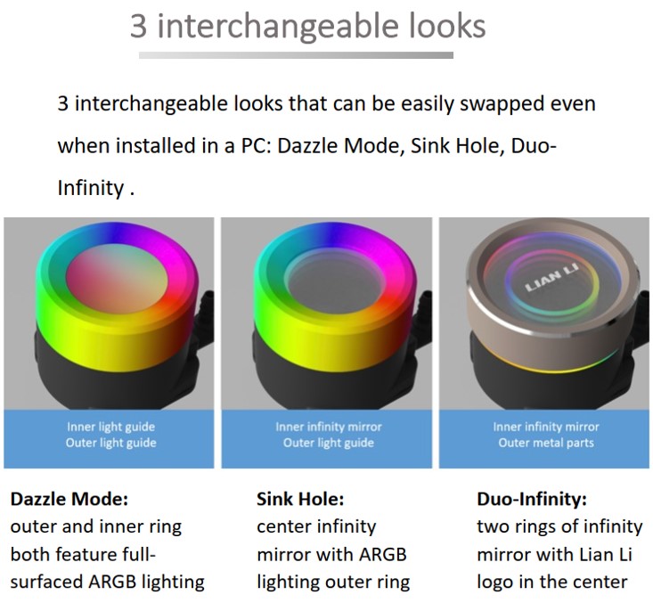 Παράλληλα με τη φανταστική απόδοση ψύξης, η Galahad II Trinity διαθέτει επίσης υπέροχη αισθητική. Υπάρχουν τρία καπάκια ARGB για την αντλία CPU, καθένα από τα οποία προσφέρει το δικό του μοναδικό στυλ. Το πρώτο καπάκι ονομάζεται Duo-Infinity, το οποίο περιλαμβάνει περίβλημα από αλουμίνιο που περιβάλλει έναν όμορφο καθρέφτη απείρου κάλλους, με το λογότυπο της Lian Li στο κέντρο. Ακολουθεί το καπάκι Dazzle, το οποίο διαθέτει δύο ξεχωριστές περιοχές φωτισμού, ένα περίβλημα diffuser φωτός ARGB και ένα στο κέντρο του καπακιού, ώστε να μπορούν να εμφανίζονται ταυτόχρονα δύο διαφορετικά χρώματα. Τέλος, το Sink-Hole συνδυάζει τα δύο σχέδια, με το περίβλημα του diffuser ARGB και ένα κέντρο με καθρέφτη απείρου, δημιουργώντας ένα κομψό εφέ φωτισμού.